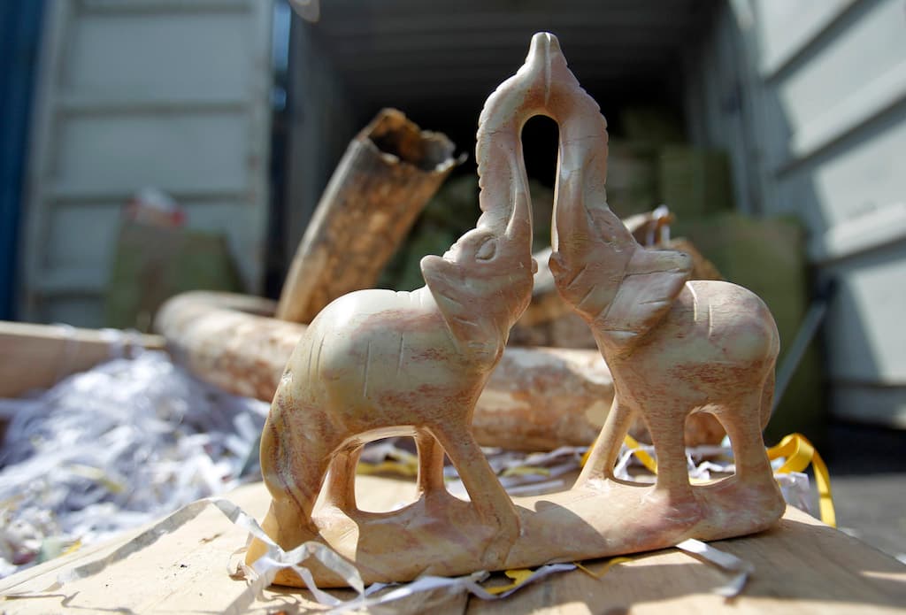 Ivory carvings and seized elephant tusks at a Malaysian customs office in Port Klang, Dec. 13, 2011.