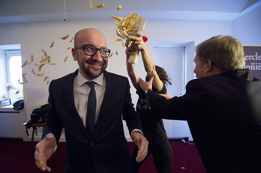 Watch the Belgian prime minister get pelted with mayonnaise and fries