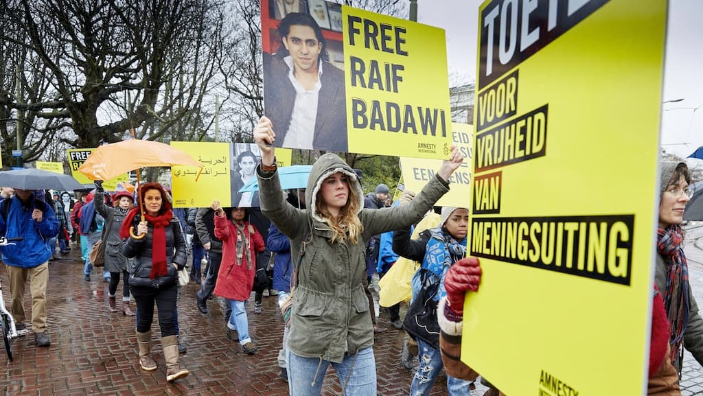 A picture of Saudi blogger Raif Badawi (C) is seen between others photos of prisoners in Saudi Arabia during a demonstration for his release from jail outside the Embassy of Saudi Arabia in Mexico City.