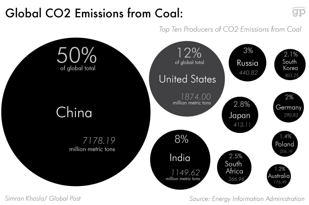 This chart shows how much CO2 the US emits from coal consumption, compared to other top polluters
