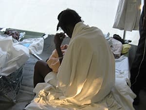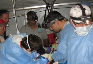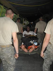 Natalie LeBrun at the field hospital being prepared for transport to University Hospital.