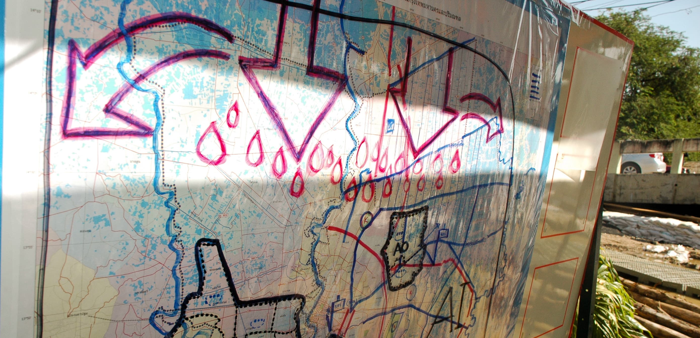 Since part of the flood barrier was destroyed in early November, authorities have mobilized police units to help residents with transportation and supplies–but also to keep the peace, should any further violence erupt. A map at the makeshift police base shows the direction of floodwater descending on central Bangkok.