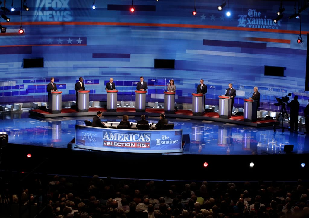 Rick Santorum, far left, and Mitt Romney, fourth from left, took the top two spots in this year’s Iowa Caucus. (Photo by Flickr user IowaPolitics.com, cc-by-sa.)