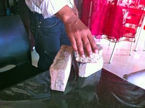 An African migrant in South Tel Aviv shows bricks he says were thrown at the front windows of his business. (Photo by Matthew Bell.)