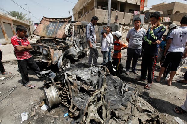 Residents gather at the site of a car bomb attack in the Kamaliya district in Baghdad April 15, 2013. Car bombs and attacks on cities across Iraq, including two blasts at a checkpoint at Baghdad international airport, killed at least 20 people and wounded more than 200 on Monday, police said. The wave of attacks in Baghdad, Kirkuk, Tuz Khurmato and other towns to the north to south, came days before Iraqis vote in provincial elections that will test political stability more than a year after U.S. troops left the country. REUTERS/Mohammed Ameen (IRAQ – Tags: CIVIL UNREST TPX IMAGES OF THE DAY) – RTXYMED