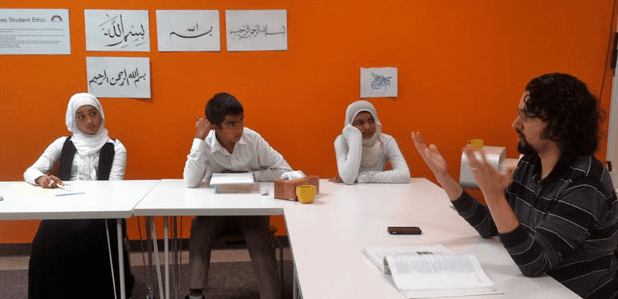 At the Averroes Institute, students, pictured here with teacher Zaki Hassan, attend a school named after Muslim philosopher Ibn Rushd, known as Averroes in the West. (Photo by Monica Campbell.)