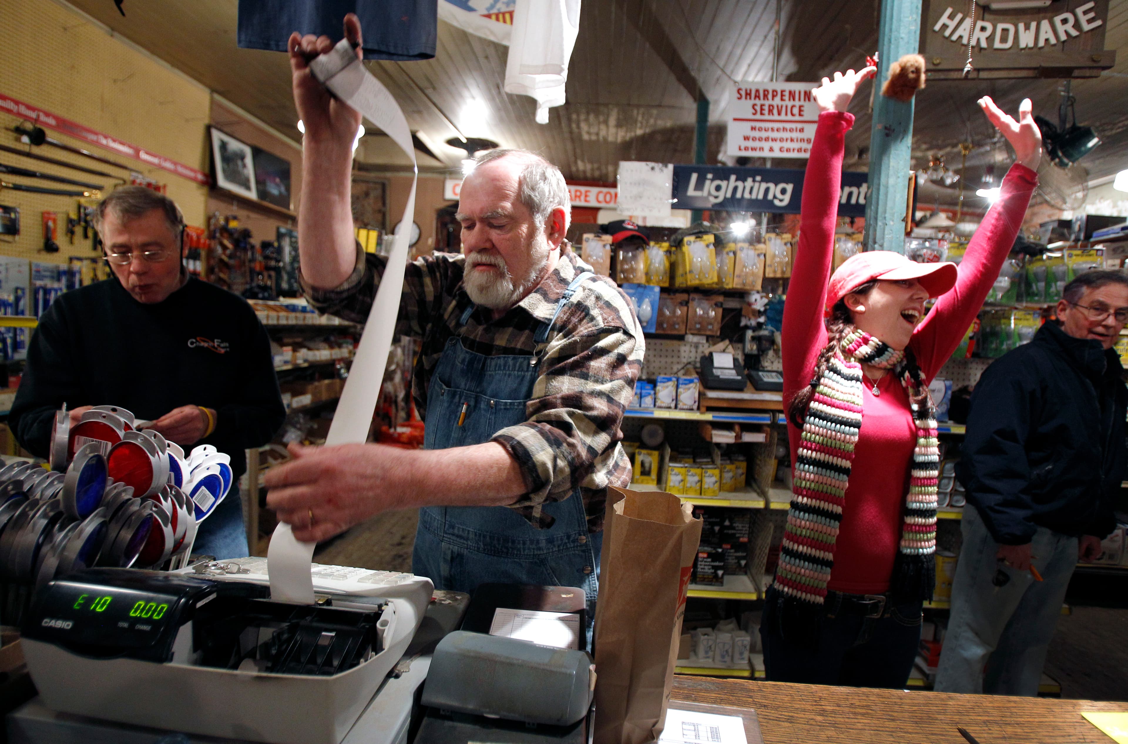 Steve Shutts, left, and Rob Schwind tally the day’s receipts, Steve’s niece Megan Johnson and brother Jack Shutts celebrate the final sale at the Chagrin Hardware in Chagrin Falls, Ohio. Hundreds of supporters of the family-owned business flocked to the s