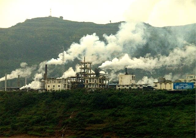 Air pollution in China is traced to factories, like this one along the Yangtze River. (Photo by user High Contrast via Wikimedia Commons.)