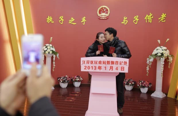 A bridegroom kisses his wife as they pose for pictures under the Chinese national emblem after having their marriage registered at a civil affairs branch office in Wuhan, Hubei province, January 4, 2013. The date numbers 201314, when pronounced in Mandarin, sounds similar to “Ai Ni Yi Sheng Yi Shi”, which means “loving you for my whole life” in English. Hundreds of thousands of people throughout China made appointments to register their marriages on the day, according to local media. REUTERS/Stringer (CHINA – Tags: SOCIETY) CHINA OUT. NO COMMERCIAL OR EDITORIAL SALES IN CHINA