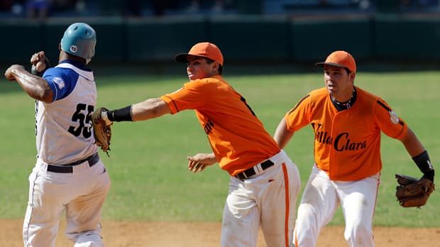 Villa Clara’s short stop Aledmis Diaz (center) tries to put out Industriales’ Mayeta during their final playoff baseball game in the Cuban National Series in Havana. (Photo: Enrique De La Osa/REUTERS)