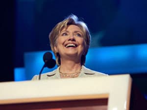 Senator Hillary Rodham Clinton checks the podium on stage. (Image: DemConvention, Flickr)