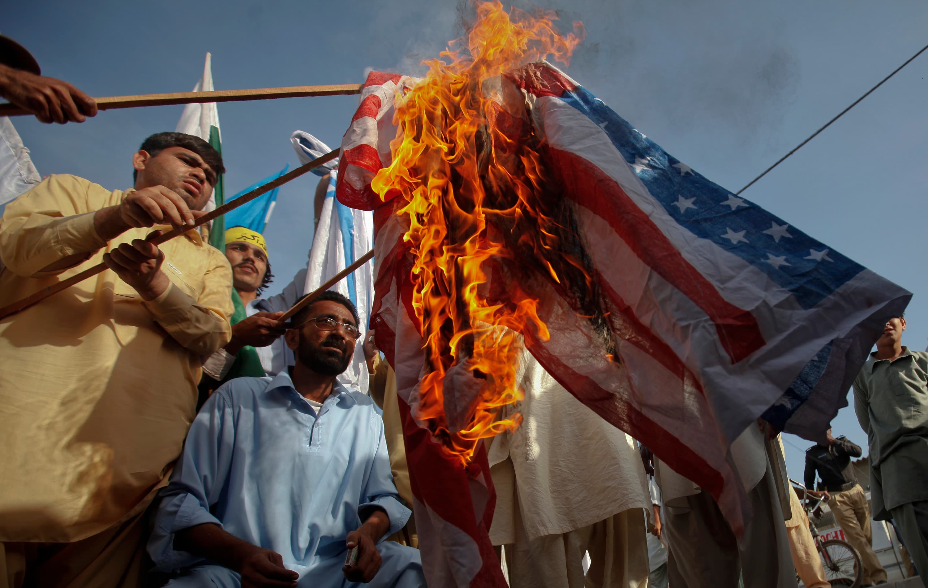 Supporters of Shabab-e-Milli, the youth wing of the Jamaat-e-Islami party, burn the U.S. flag during an anti-American demonstration in Karachi on March 16, 2012. Some 100 protestors gather to demonstrate on Friday against the killing of at least 16 villag