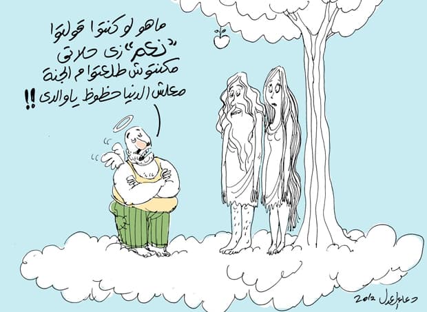 The cartoon above for which Doaa Eladl is being sued for depicts Adam and Eve standing beneath an apple tree on a cloud. The angel is an Egyptian man who tells the couple that they would have never been expelled from heaven if they had voted in favor of the of the referendum on Egypt’s new constitution.