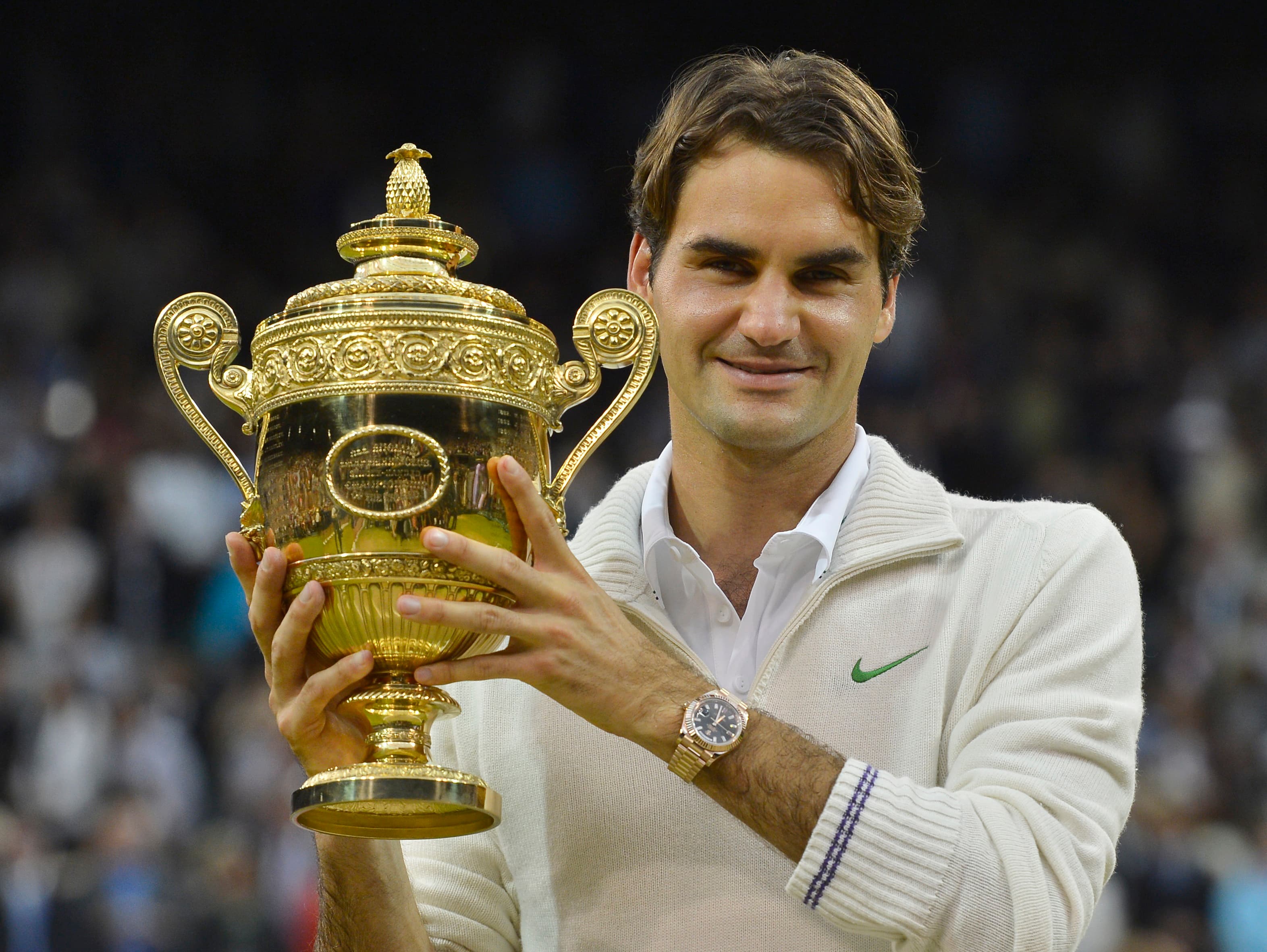 Roger Federer of Switzerland holds the winners trophy after defeating Andy Murray of Britain in their men’s final tennis match at the Wimbledon Tennis Championships in London. (Photo by Toby Melville/REUTERS.)
