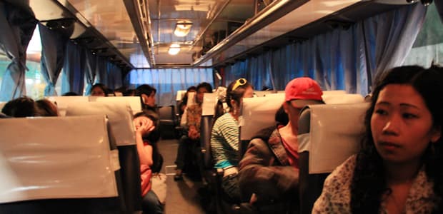 Mary Ann Lagahet and other women who just returned from Syria catch a ride on a bus from the airport to the Philippines reintegration center. (Photo by Aurora Almendral.)