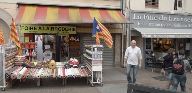 Outside a stationary store in the regional capital, Perpignan, red and yellow striped Catalan flags flap in the breeze. You might think it’s a political statement, but the store owner, Frederique Abribas, says he also sells French flags. Abribas is a French Catalan but he doesn’t pay much attention to Spanish Catalonia’s independence drive.