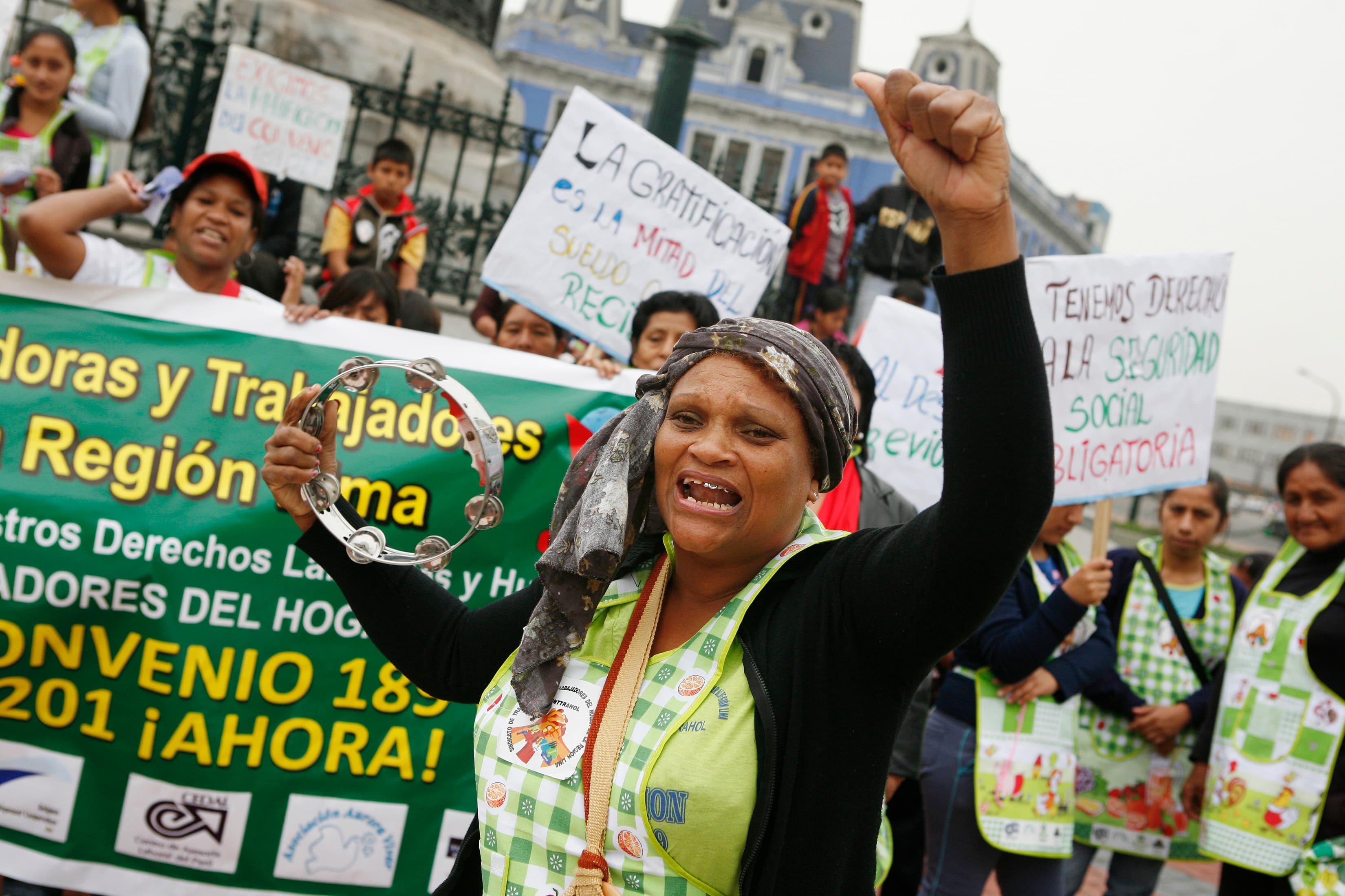 Maids shout slogans during a demonstration to demand respect for human and labour rights in downtown Lima June 15, 2012. The domestic workers were asking for no less than the minimum wage, 8-hour day shifts, social security and holidays. REUTERS/Enrique Castro-Mendivil (PERU – Tags: CIVIL UNREST BUSINESS EMPLOYMENT) – RTR33OJH