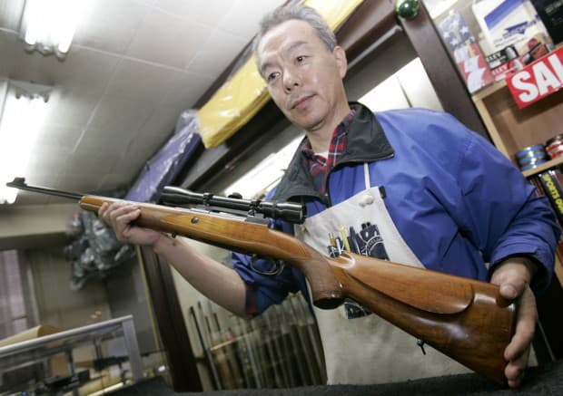 Tadakazu Shimoyama, chief mechanician at the Ennis gun shop, displays a rifle in Tokyo April 17, 2007. Gun ownership in Japan is extremely limited because of the country’s strict licensing regulations for firearms and ammunition sales. REUTERS/Yuriko Nakao(JAPAN)