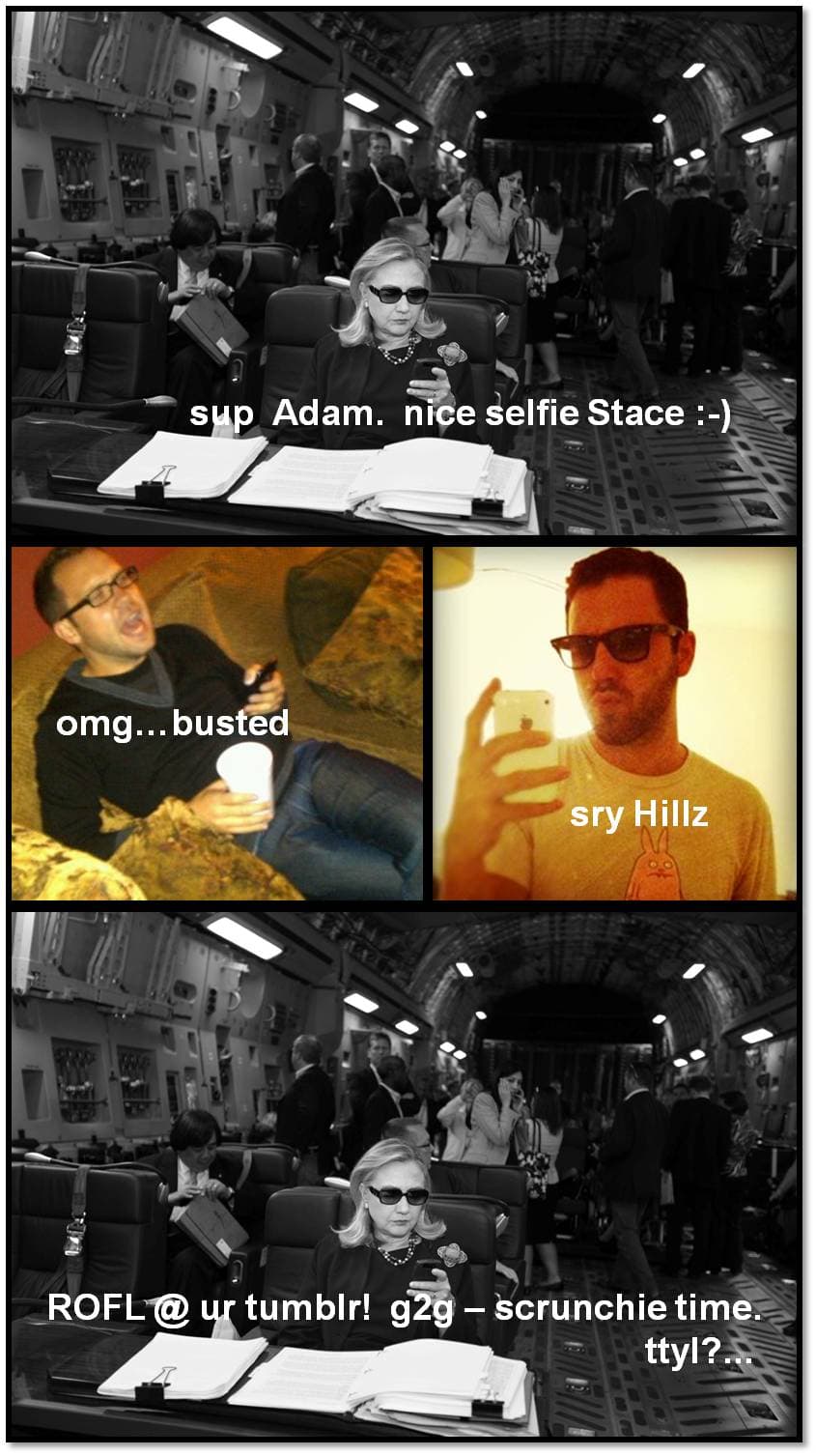 The meme, though, officially went mainstream Tuesday when Clinton submitted her own Text From Hillary and even met with founders Adam Smith and Stacy Lambe. In her submission, Clinton said “sup Adam. nice selfie Stace :-)” The two reply “omg…busted” and “sry Hillz”. Clinton replies “ROFL @ ur Tumblr! g2g scrunchie time. ttyl?!”