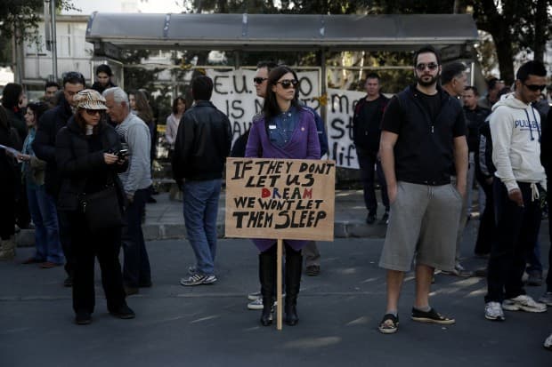 Protesters take part in an anti-bailout rally outside the parliament in Nicosia March 18, 2013. Cypriot ministers were trying to revise a plan to seize money from bank deposits before a parliamentary vote on Tuesday that will secure the island’s financial rescue or could lead to its default, with reverberations across the euro zone. REUTERS/Yorgos Karahalis (CYPRUS – Tags: POLITICS CIVIL UNREST BUSINESS) – RTR3F5OL