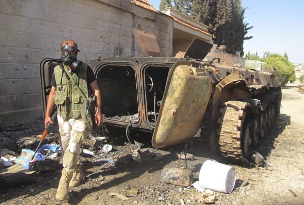 A Free Syrian Army fighter wearing a gas mask, carries his weapons as he walks past a damaged tank, after seizing a government military camp used by forces loyal to Syria’s President Bashar al-Assad, near Idlib, June 13, 2013. Picture taken June 13, 2013. REUTERS/Abdalghne Karoof (SYRIA – Tags: CONFLICT) – RTX10NNC