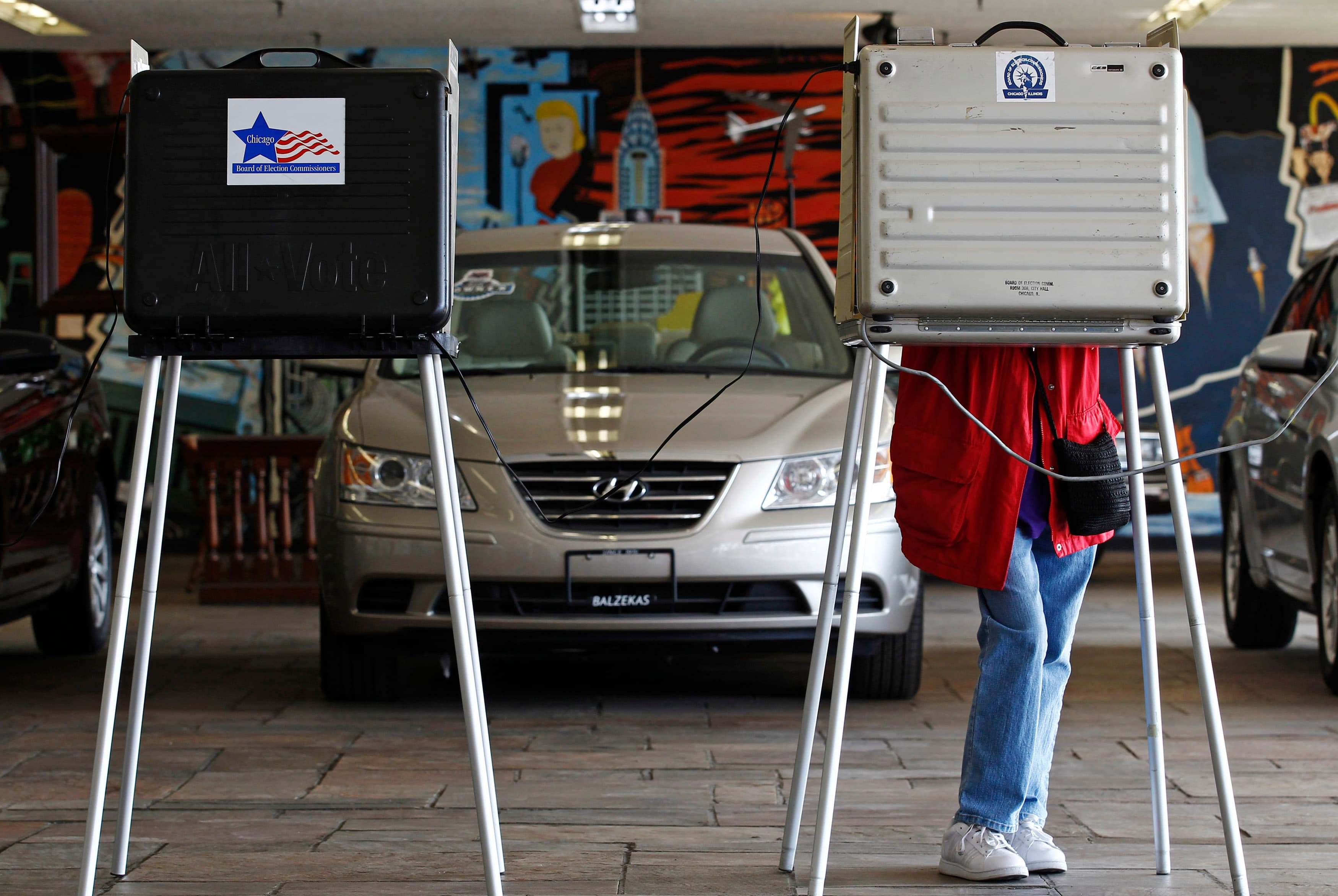 A voter casts her ballot in the Illinois primary at a car dealership being used as a polling station in Chicago, Illinois, March 20, 2012. (Photo by Jim Young/Reuters.)