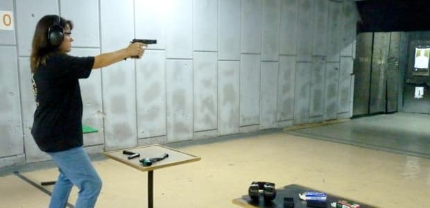 An Israeli woman practices shooting at a Jerusalem firing range. Most gun ownership is outlawed in Israel. (Photo by Matthew Bell.)
