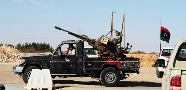 Militia, acting as government forces, drive through a checkpoint some 60 kilometers from Bani Walid. The town is known as the last bastion of Gaddafi supporters in Libya. (Photo by Gaia Anderson.)