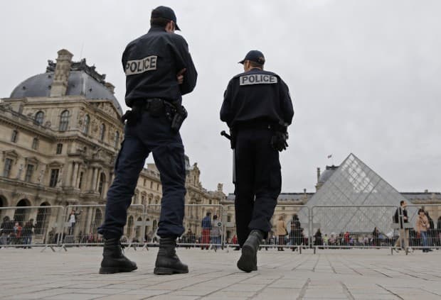 French police patrol next to the Pyramid in the Louvre museum in Paris April 11, 2013 a day after a one-day closure of the Louvre, as guards protested that pickpockets were rampant at the world’s most visited museum. Two hundred museum guards exercised their right to a work stoppage, forcing the museum to shut its doors for the day, union representatives said. REUTERS/Christian Hartmann (FRANCE – Tags: CRIME LAW SOCIETY) – RTXYHED