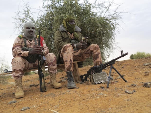 Malian soldiers with their faces covered sit on a bench in the recently recaptured town of Gao January 27, 2013. French and Malian troops retook the major Saharan trading towns of Gao and Timbuktu from Islamist rebels at the weekend. Picture taken January 27, 2013. REUTERS/Adama Diarra (MALI – Tags: POLITICS CIVIL UNREST MILITARY TPX IMAGES OF THE DAY) – RTR3D6LX