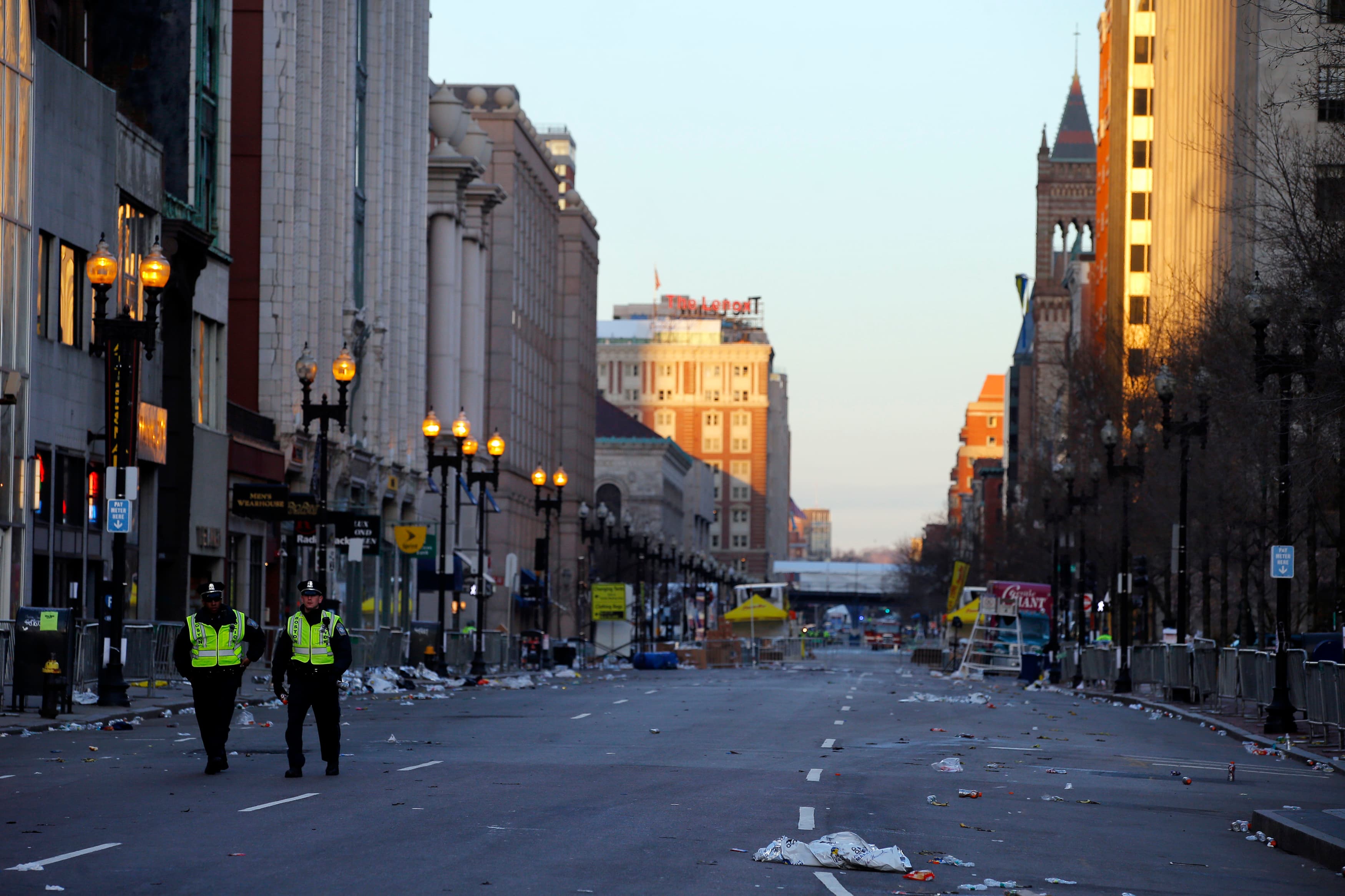 Two police officers walk down Boylston Street, away from the finish line of the Boston Marathon in Boston on April 16, 2013. Two bombs packed with debris, doctor say, tore through crowds near the finish of the Boston Marathon. (Photo by Brian Snyder/Reute