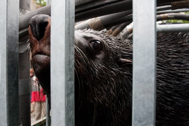 Evakuace lachtan? a tu??ák? do horní ?ásti Zoo Praha. Tu??áci obývají do?asn? expozici vyder a lachtani ?ásten? zázemí hroch? a ?áste?n? zázemí ledních medv?d?.