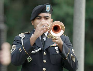 A member of the Army I Corps band plays “Taps” at a memorial service for U.S. Army Spc. Brittany Gordon, Wednesday, Nov. 14, 2012, at Joint Base Lewis McChord, Wash. Gordon was killed in Afghanistan by a suicide bomber.