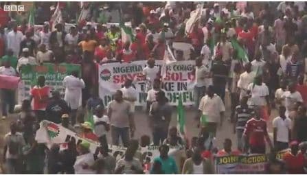 Anchor Lisa Mullins talks to the BBC’s Tommy Oladipo is in Lagos says tens of thousands of Nigerians took to the streets to protest the government’s decision to remove the subsidies leading to higher gas prices.