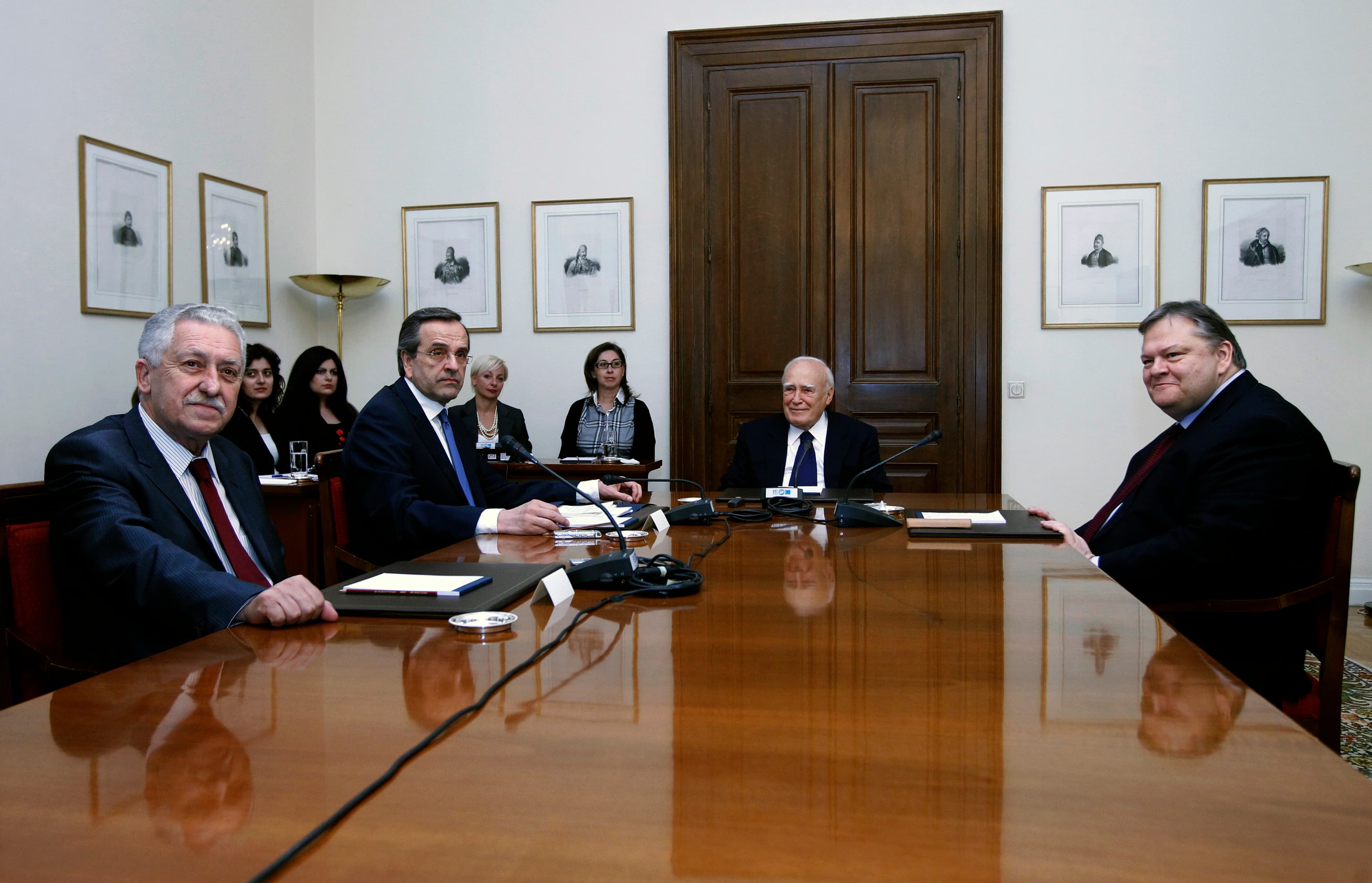 Leader of the Democratic Left party Fotis Kouvelis, from left, leader of Conservatives New Democracy party Antonis Samaras, Greek President Karolos Papoulias and head of Socialist PASOK party Evangelos Venizelos, meet in Athens May 14, 2012. (Photo by Joh