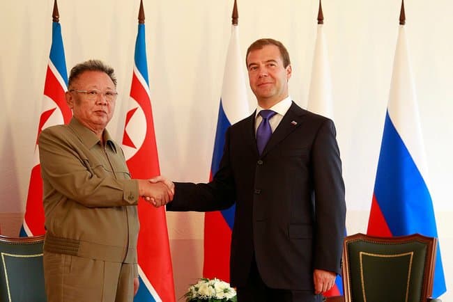 Kim Jong Il with Russian President Dmitry Medvedev in Ulan-Ude on Aug. 24, 2011. (Photo by Russian Presidential Press and Information Office via Wikimedia Commons.)