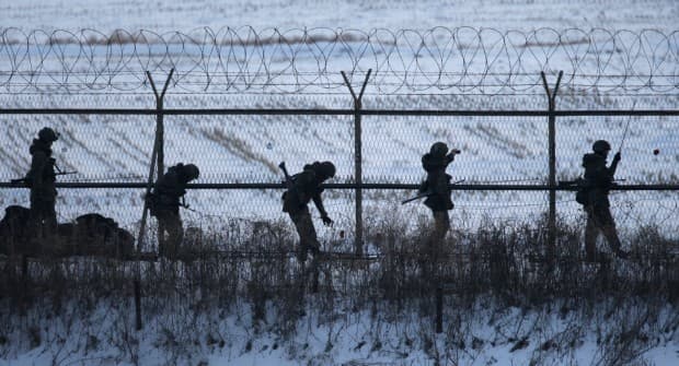 South Korean soldiers check military fences as they patrol near the demilitarized zone separating North Korea from South Korea, in Paju, north of Seoul February 12, 2013. North Korea conducted its third nuclear test on Tuesday in defiance of U.N. resolutions, angering the United States and Japan and prompting its only major ally, China, to call for calm. REUTERS/Lee Jae-Won (SOUTH KOREA – Tags: MILITARY POLITICS) – RTR3DO9T