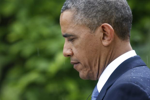 U.S. President Barack Obama listens to a question in the rain during a joint news conference with Turkish Prime Minister Recep Tayyip Erdogan in the White House Rose Garden in Washington, May 16, 2013. REUTERS/Kevin Lamarque (UNITED STATES – Tags: POLITICS) – RTXZPFZ