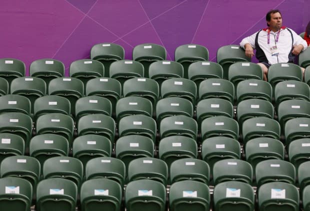 A spectator sits amid empty seats at the All England Lawn Tennis Club during the women’s singles match between Denmark’s Caroline Wozniacki and Great Britain’s Anne Keothavong at the London 2012 Olympics Games July 28, 2012. REUTERS/Stefan Wermuth (BRITAIN – Tags: OLYMPICS SPORT TENNIS)