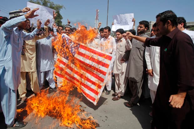 Students from different institutions burn a flag representing the U.S. during an anti-American rally in Peshawar. (Photo by Fayaz Aziz/Reuters.)