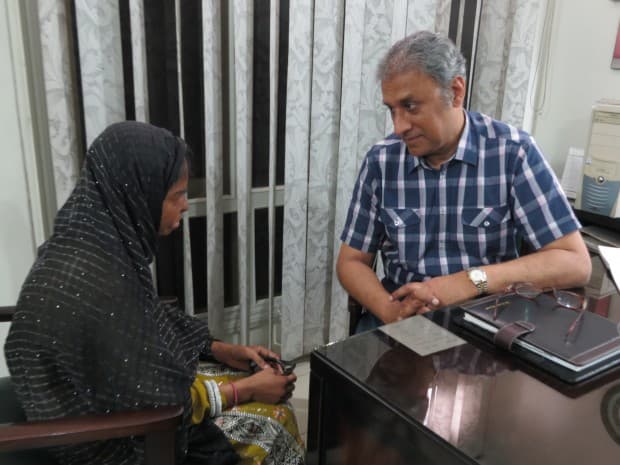 Acid burn attack victim Sidra Yasmeen speaks with Dr. Hamid Hassan, who has performed two surgeries to reconstruct her face and neck. (Photo by Beenish Ahmed.)