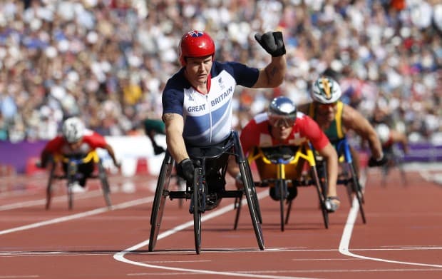 Britain’s David Weir celebrates winning his heat of the Men’s 800m -T54 at the London 2012 Paralympic Games in the Olympic Stadium September 5, 2012. T-54 is a classification for wheelchair athletes. REUTERS/Suzanne Plunkett (BRITAIN – Tags: SPORT OLYMPICS ATHLETICS PROFILE)