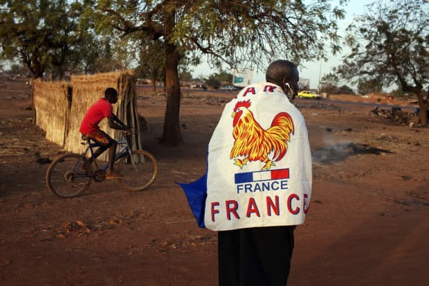 Yacouba Konate, 56, wears a French flag to show his support for the French military intervention in Mali in the Malian capital of Bamako January 13, 2013. France is determined to end Islamist domination of northern Mali, which many fear could act as a base for attacks on the West and for links with al Qaeda in Yemen, Somalia and North Africa. REUTERS/Joe Penney (MALI – Tags: SOCIETY CIVIL UNREST)