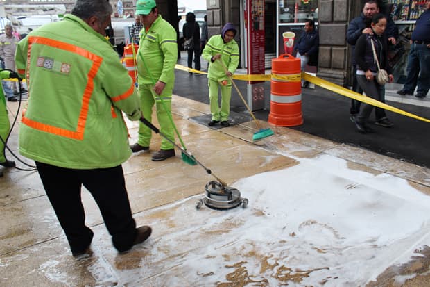 A worker cleans gum from the sidewalk. (Photo: Ari Daniel Shapiro)