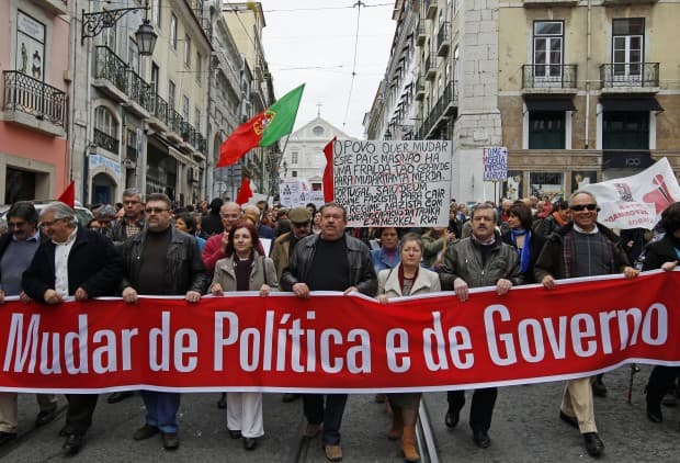 Demonstrators march while holding a banner reading, “Change policy and government”, during a protest in Lisbon February 16, 2013. General Confederation of the Portuguese Workers (CGTP) Intersindical workers union on Saturday, held demonstrations in Portuguese cities to protest against government austerity policies. REUTERS/Jose Manuel Ribeiro (PORTUGAL – Tags: POLITICS BUSINESS EMPLOYMENT CIVIL UNREST) – RTR3DVU7