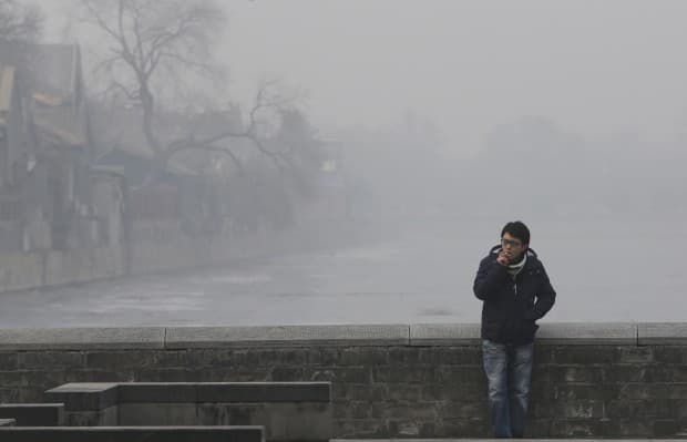 A man smokes near the Forbidden City on a heavy haze day in central Beijing January 13, 2013. Air quality in Beijing was the “worst on record” on Saturday and Sunday, according to environmentalists, as the city’s pollution monitoring centre warned residents to stay indoors with pollution 30-45 times above recommended safety levels. REUTERS/Jason Lee (CHINA – Tags: ENVIRONMENT SOCIETY)