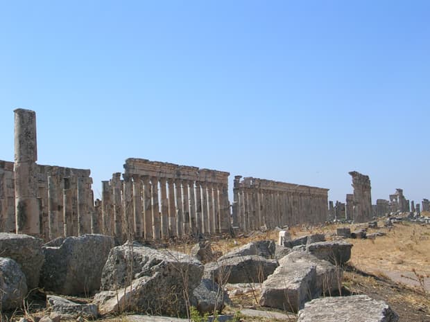 The ruins of Afamia in Syria. They have since been looted and damaged by tanks, military emplacements and shelling. (Photo courtesy of Emma Cunliffe.)