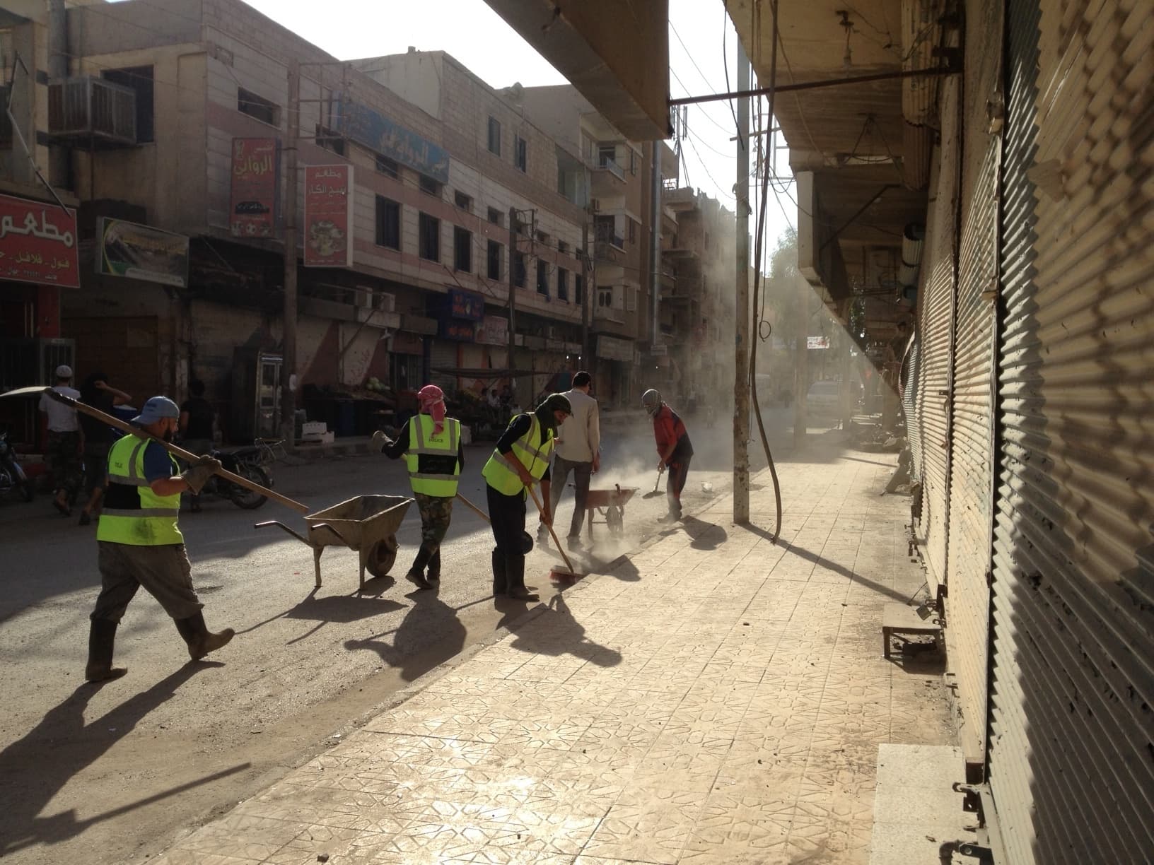 The first people we see are a dozen men with shovels and bright yellow jackets. These locals fight the regime of Bashar al-Assad at night. During the day, they clean up the ravages of war.