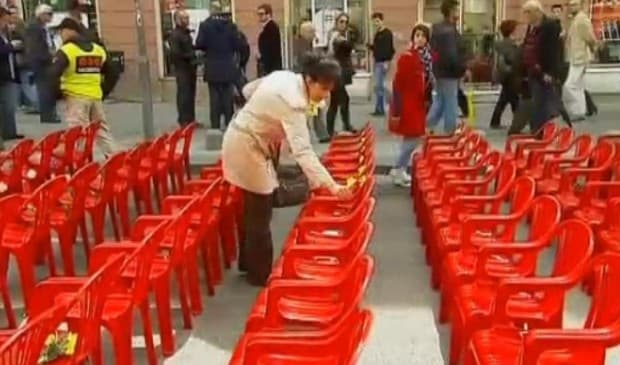 Sarajevo resident laying flowers on chairs to honor victims of siege (Photo: BBC)