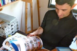 Shay Charka flips through one of his books at his home studio in an Israeli settlement in the northern West Bank. (Photo by Matthew Bell.)